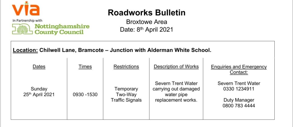 Roadworks Bulletin – Temporary Traffic Signals – Chilwell Lane, Bramcote 8Apr 20218 Apr 2021Add a comment Roadworks Bulletin – Temporary Traffic Signals – Chilwell Lane, Bramcote Share this:Tweet Click to share on WhatsApp (Opens in new window) WhatsApp Click to email a link to a friend (Opens in new window) Email Like Loading... Related