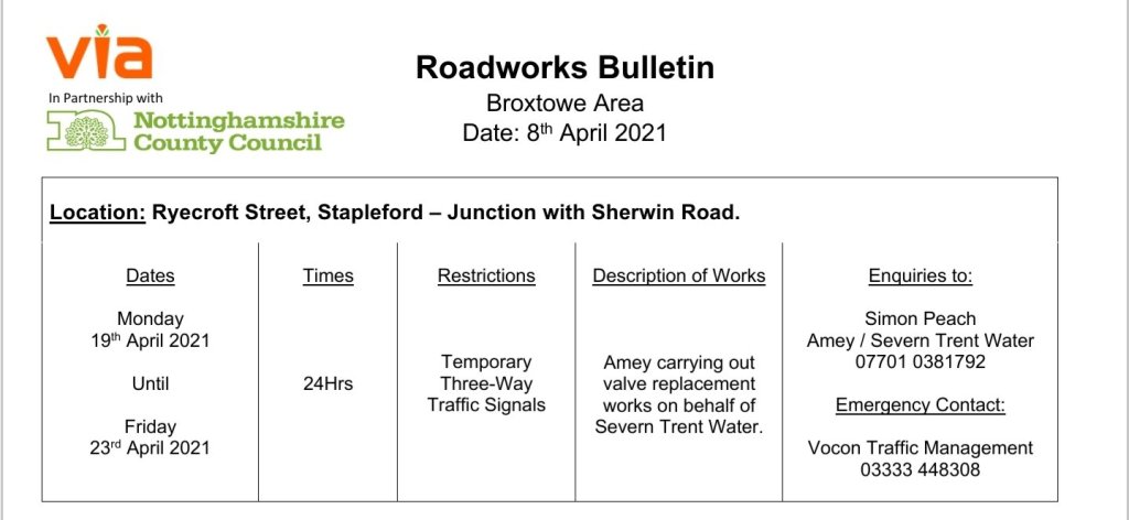Roadworks Bulletin – Temporary Traffic Signals – Ryecroft Street, Stapleford. 8Apr 20218 Apr 2021Add a comment Roadworks Bulletin – Temporary Traffic Signals – Ryecroft Street, Stapleford. Share this:Tweet Click to share on WhatsApp (Opens in new window) WhatsApp Click to email a link to a friend (Opens in new window) Email Like Loading... Related