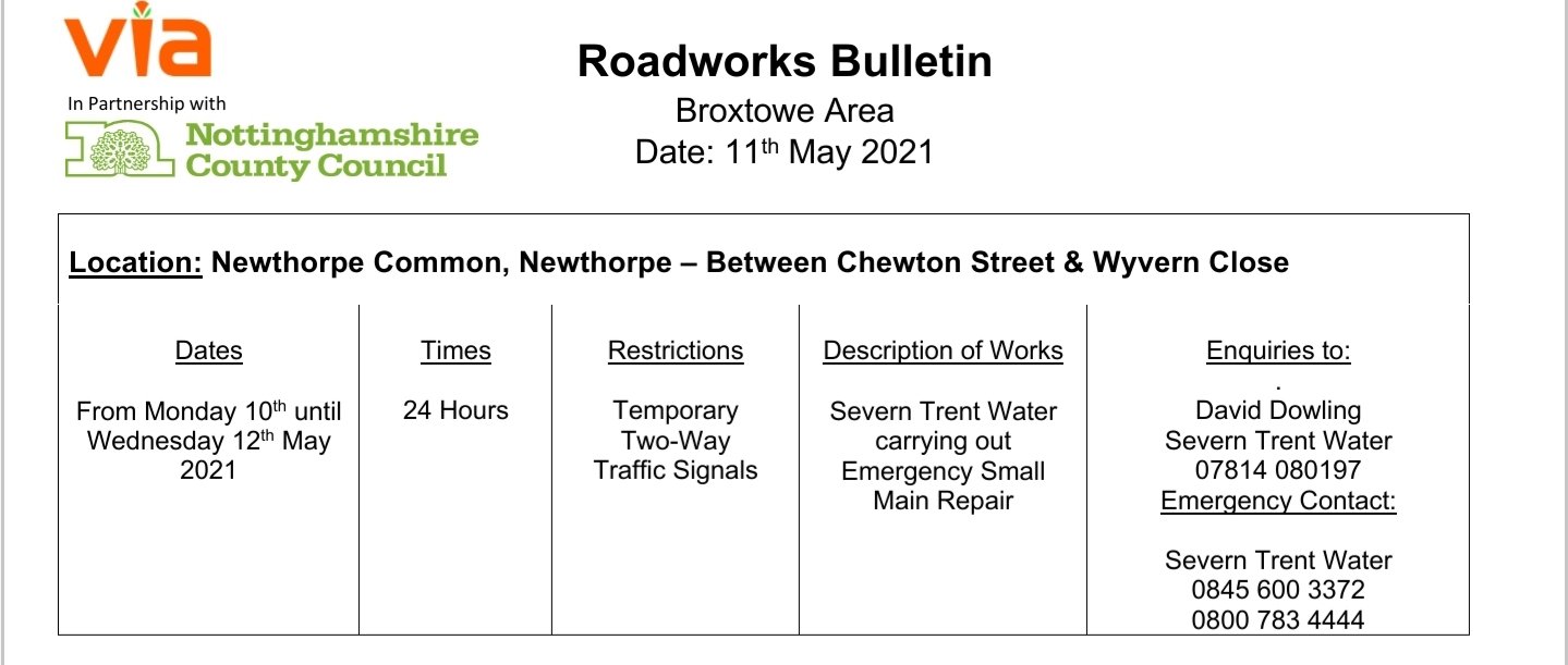 Roadworks Bulletin – Temporary Traffic Signals – Newthorpe Common, Newthorpe 11May 2021Add a comment Roadworks Bulletin – Temporary Traffic Signals – Newthorpe Common, Newthorpe Share this:Tweet Click to share on WhatsApp (Opens in new window) WhatsApp Click to email a link to a friend (Opens in new window) Email Like Loading... Related