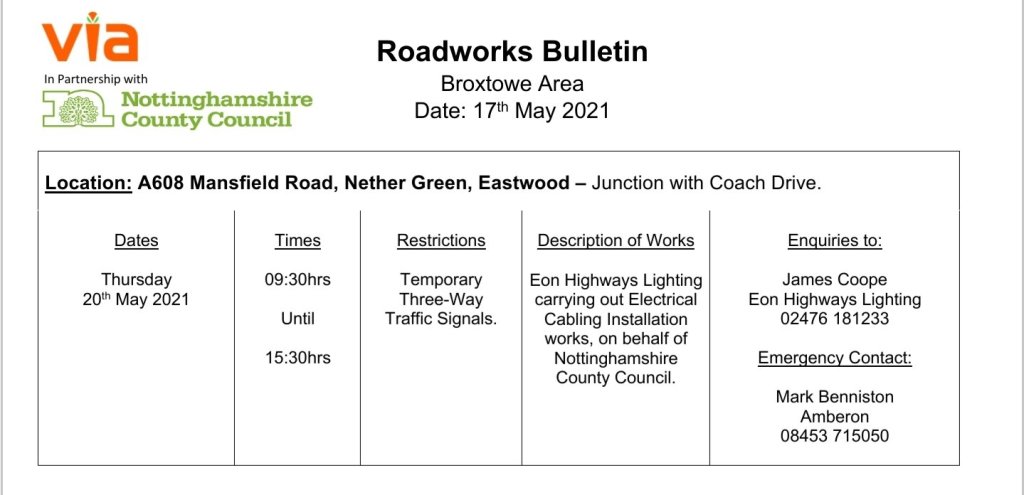 Roadworks Bulletin – Temporary Traffic Signals – A608 Mansfield Road, Eastwood 17May 2021Add a comment Roadworks Bulletin – Temporary Traffic Signals – A608 Mansfield Road, Eastwood Share this:Tweet Click to share on WhatsApp (Opens in new window) WhatsApp Click to email a link to a friend (Opens in new window) Email Like Loading... Related