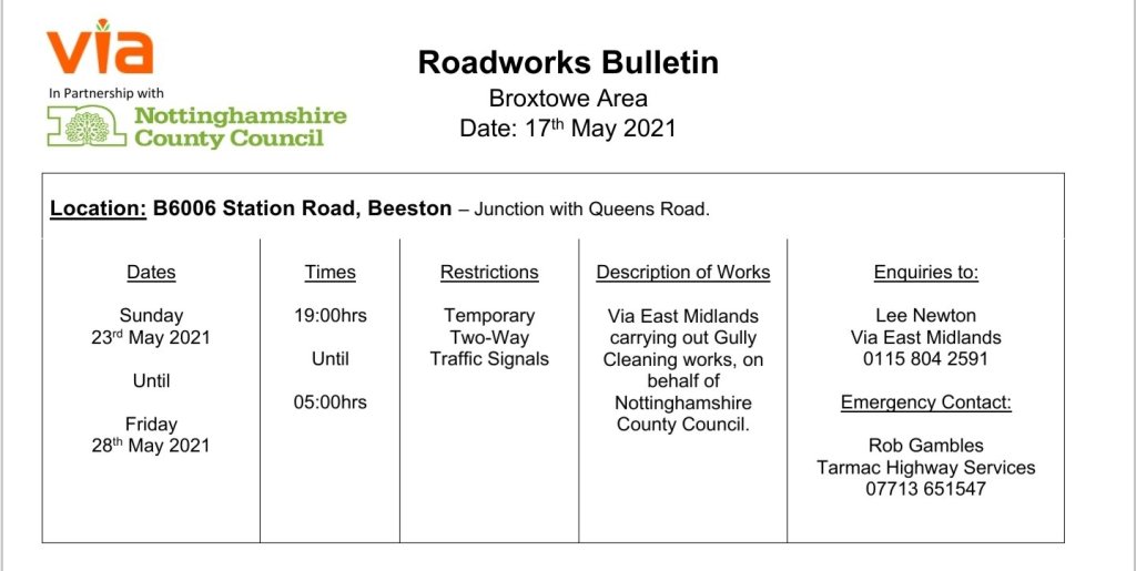 Roadworks Bulletin – Temporary Traffic Signals – B6006 Station Road, Beeston 17May 2021Add a comment Roadworks Bulletin – Temporary Traffic Signals – B6006 Station Road, Beeston Share this:Tweet Click to share on WhatsApp (Opens in new window) WhatsApp Click to email a link to a friend (Opens in new window) Email Like Loading... Related