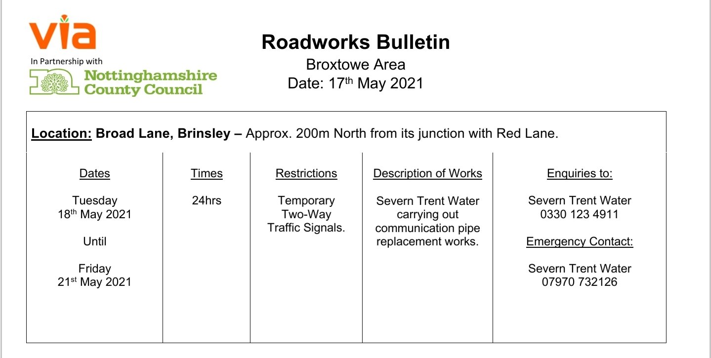 Roadworks Bulletin – Temporary Traffic Signals – Broad Lane, Brinsley 17May 2021Add a comment Roadworks Bulletin – Temporary Traffic Signals – Broad Lane, Brinsley Share this:Tweet Click to share on WhatsApp (Opens in new window) WhatsApp Click to email a link to a friend (Opens in new window) Email Like Loading... Related