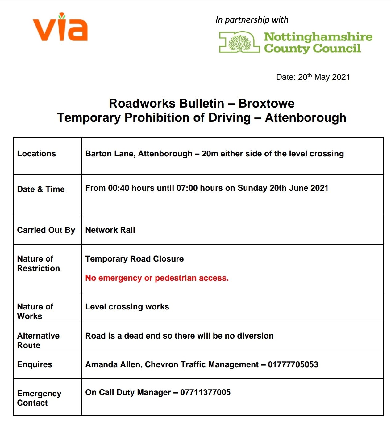 Roadworks Bulletin – Temporary Road Closure – Barton Lane, Attenborough 20May 2021Add a comment Roadworks Bulletin – Temporary Road Closure – Barton Lane, Attenborough Share this:Tweet Click to share on WhatsApp (Opens in new window) WhatsApp Click to email a link to a friend (Opens in new window) Email Like Loading... Related