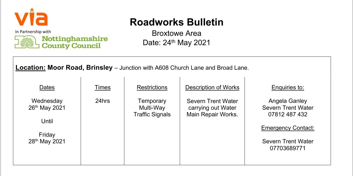 Roadworks Bulletin – Temporary Traffic Signals – Moor Road, Brinsley 24May 2021Add a comment Roadworks Bulletin – Temporary Traffic Signals – Moor Road, Brinsley Share this:Tweet Click to share on WhatsApp (Opens in new window) WhatsApp Click to email a link to a friend (Opens in new window) Email Like Loading... Related