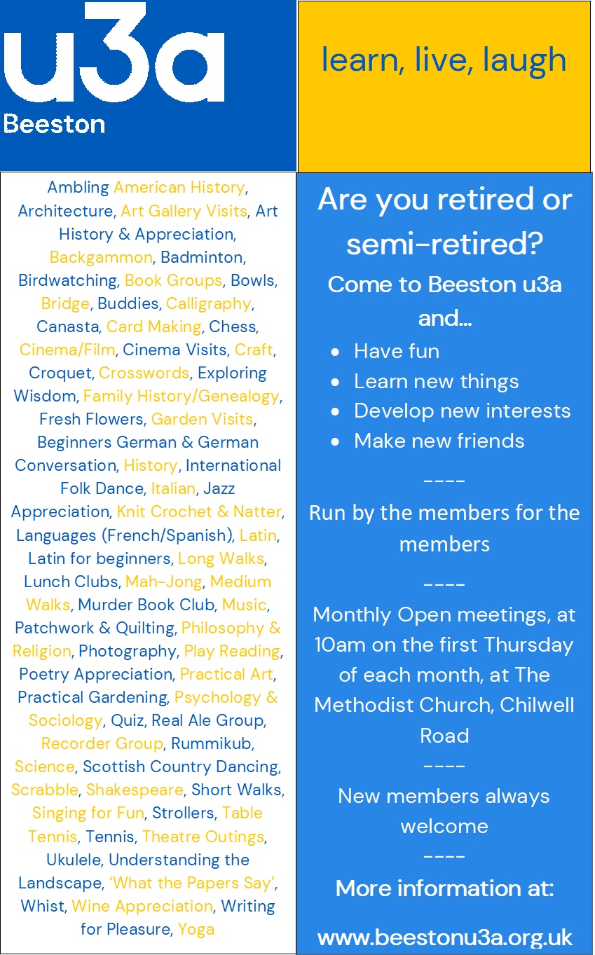 National u3a day Wednesday 2nd June 31May 2021Add a comment U3A is a great organisation. I helped with the initial set up of rhe Stapleford group which has grown over the years. The Beeston group have invited me to meet them on Wednesday and it’s something I am looking forward to doing. Share this:Tweet Click to share on WhatsApp (Opens in new window) WhatsApp Click to email a link to a friend (Opens in new window) Email Like Loading... Related