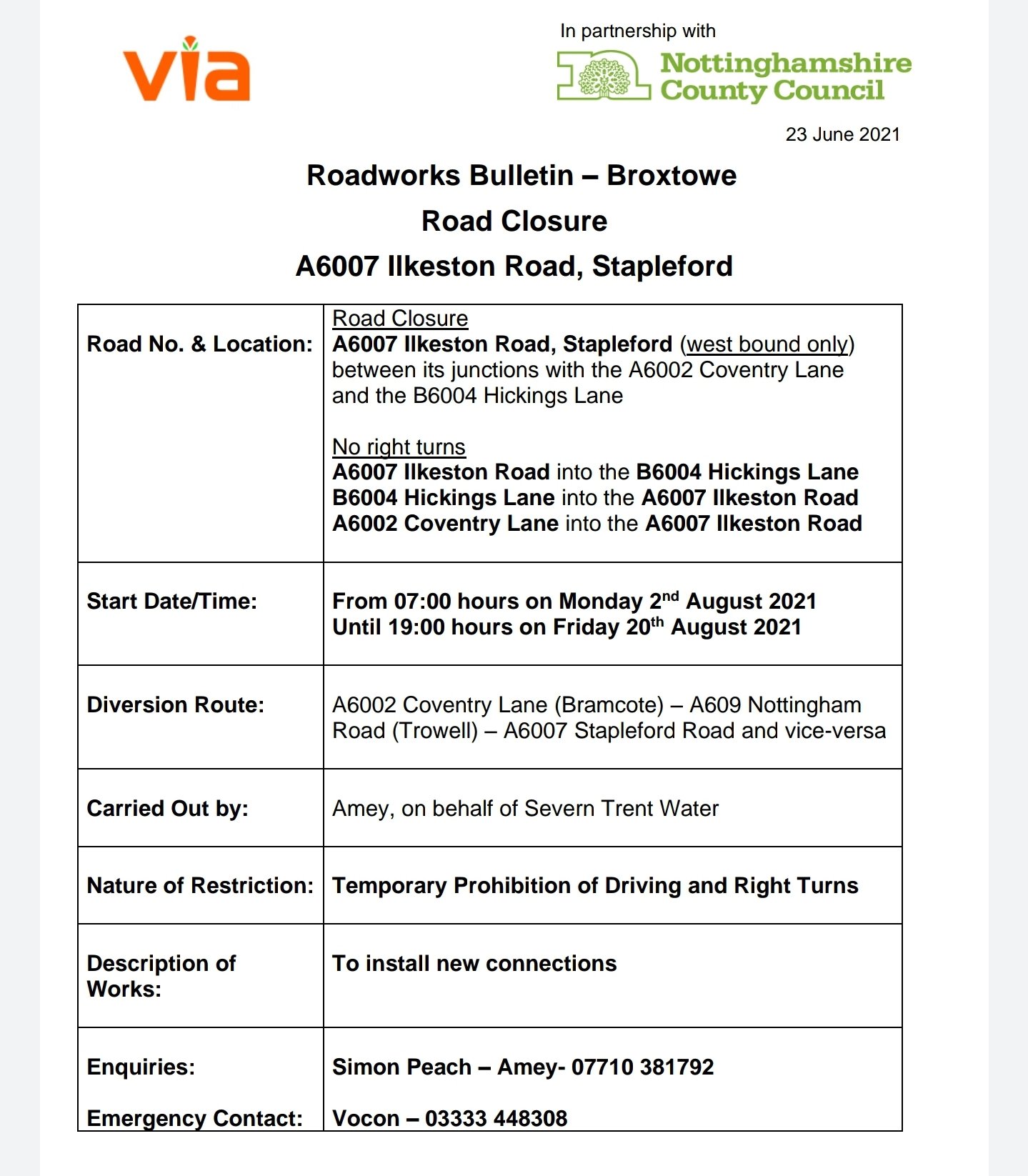 Roadworks Bulletin – Temporary Road Closure – Ilkeston Road, Stapleford (2-20/8) 23Jun 2021Add a comment Roadworks Bulletin – Temporary Road Closure – Ilkeston Road, Stapleford (2-20/8) Share this:Tweet Click to share on WhatsApp (Opens in new window) WhatsApp Click to email a link to a friend (Opens in new window) Email Like Loading... Related