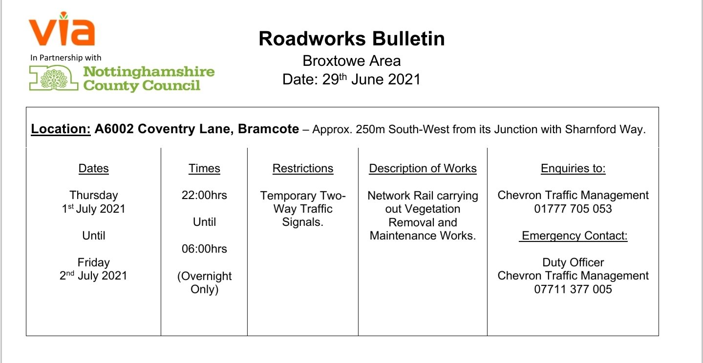 Roadworks Bulletin – Temporary Traffic Signals – A6002 Coventry Lane, Bramcote. 29Jun 2021Add a comment Roadworks Bulletin – Temporary Traffic Signals – A6002 Coventry Lane, Bramcote. Share this:Tweet Click to share on WhatsApp (Opens in new window) WhatsApp Click to email a link to a friend (Opens in new window) Email Like Loading... Related