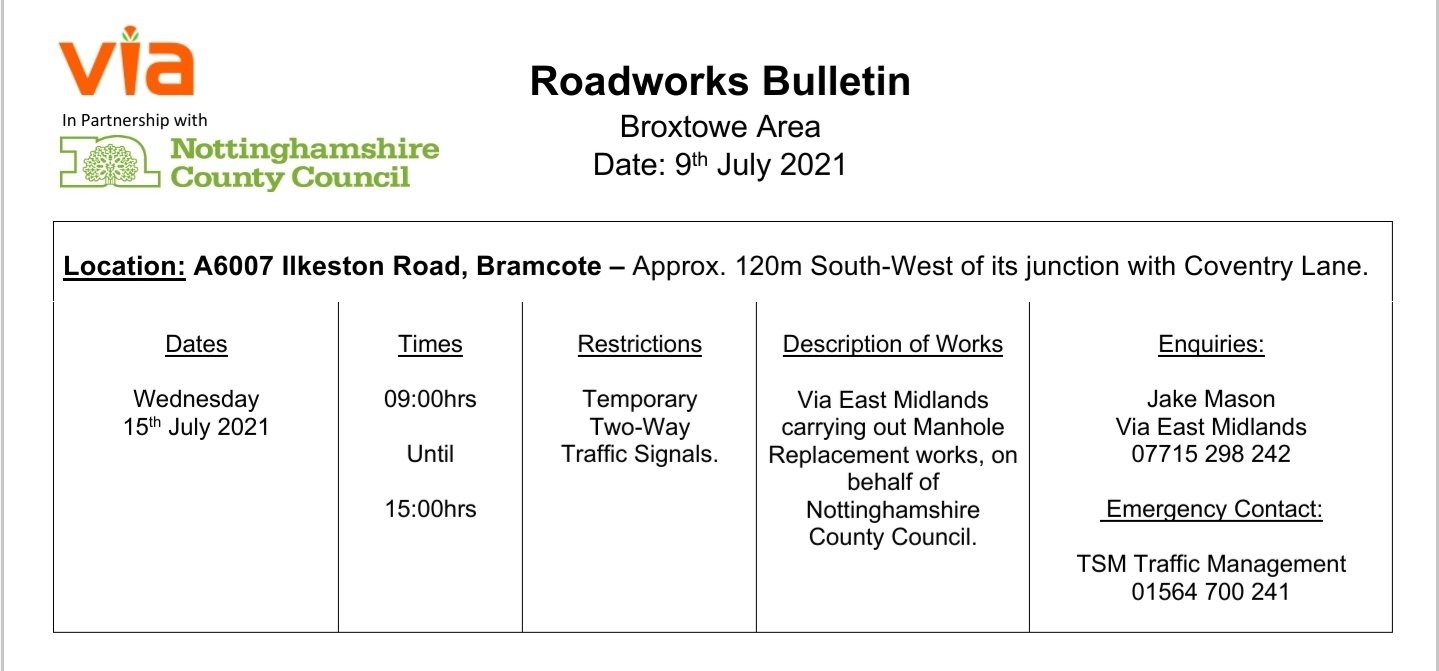Roadworks Bulletin – Temporary Traffic Signals – A6007 Ilkeston Road, Bramcote