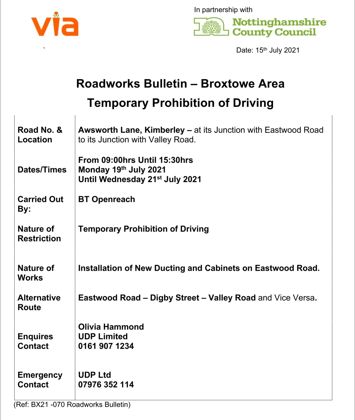 BX21-070 Roadworks Bulletin – Temporary Road Closure – Awsworth Lane 15Jul 2021Add a comment BX21-070 Roadworks Bulletin – Temporary Road Closure – Awsworth Lane Share this:Tweet Click to share on WhatsApp (Opens in new window) WhatsApp Click to email a link to a friend (Opens in new window) Email Like Loading... Related