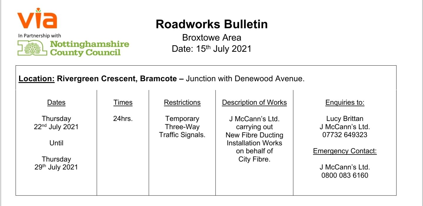 Roadworks Bulletin – Temporary Traffic Signals – Rivergreen Crescent, Bramcote 15Jul 20211 Comment Roadworks Bulletin – Temporary Traffic Signals – Rivergreen Crescent, Bramcote Share this:Tweet Click to share on WhatsApp (Opens in new window) WhatsApp Click to email a link to a friend (Opens in new window) Email Like Loading... Related