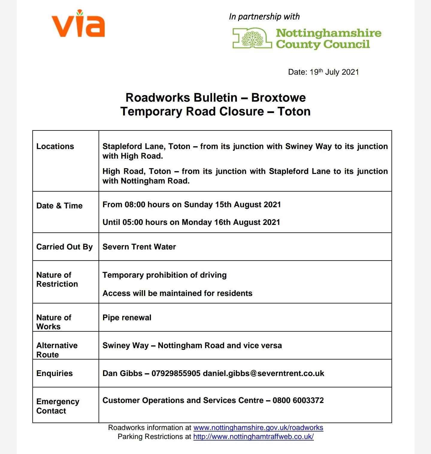 Roadworks Bulletin – BroxtoweTemporary Road Closure – Toton 19Jul 2021Add a comment Roadworks Bulletin – BroxtoweTemporary Road Closure – Toton Share this:Tweet Click to share on WhatsApp (Opens in new window) WhatsApp Click to email a link to a friend (Opens in new window) Email Like Loading... Related