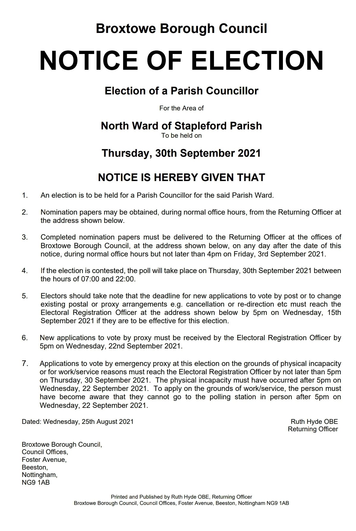 An Election has been called to fill a vacancy in the North Ward of Stapleford Parish.