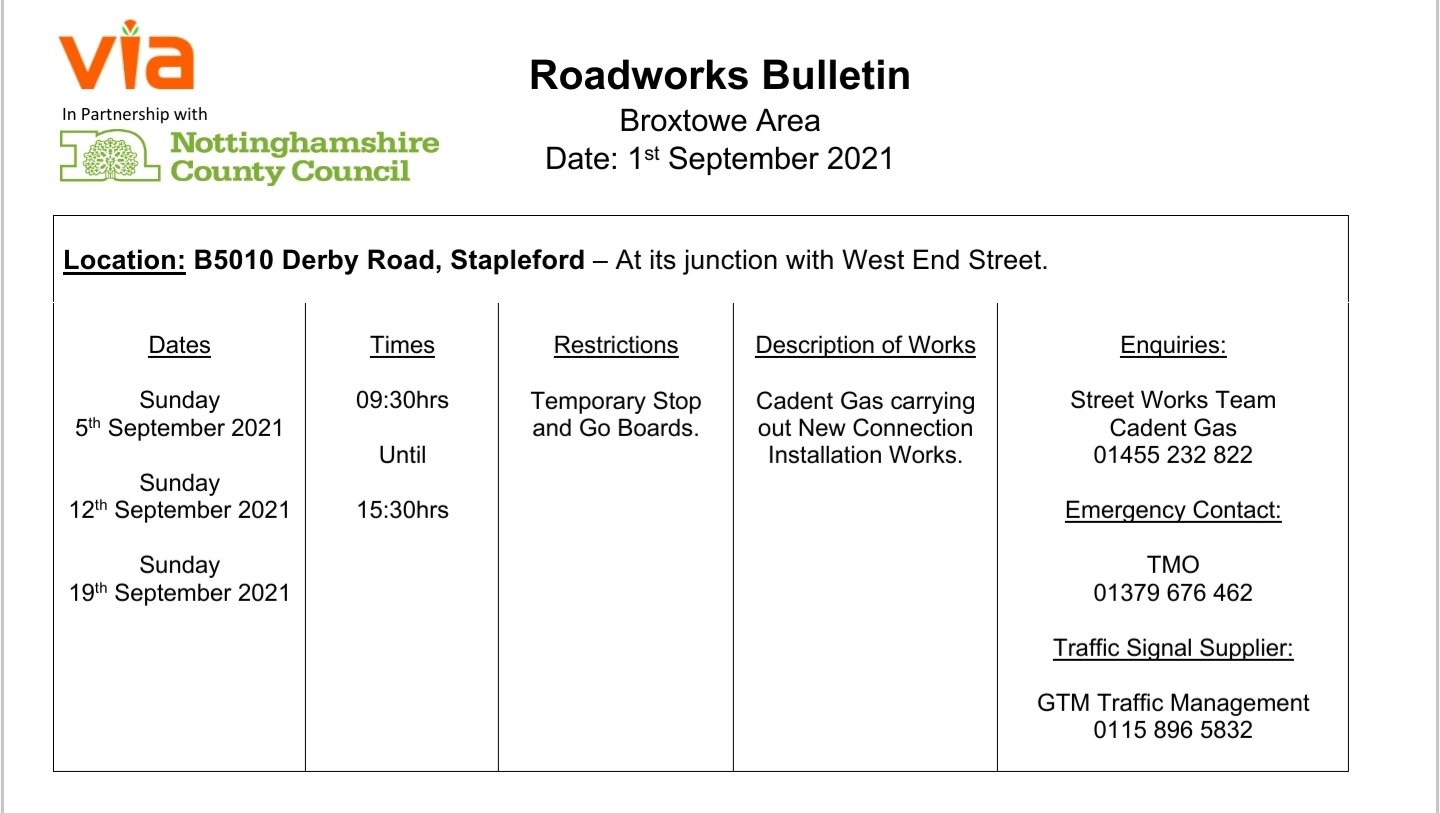 Please find attached a Roadworks Bulletin for Temporary Traffic Signals on the B5010 Derby Road, Stapleford.