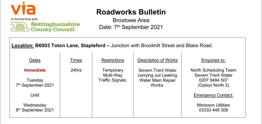 Roadworks Bulletin – Temporary Traffic Signals – B6003 Toton Lane, Stapleford (Immediate) 7Sep 2021Add a comment Roadworks Bulletin – Temporary Traffic Signals – B6003 Toton Lane, Stapleford (Immediate) Share this:Tweet Click to share on WhatsApp (Opens in new window) WhatsApp Click to email a link to a friend (Opens in new window) Email Like Loading... Related