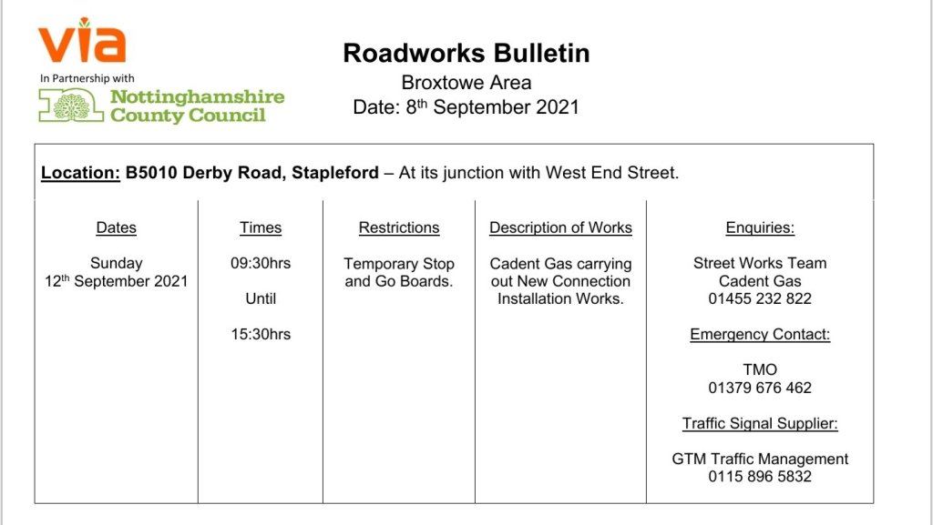 Roadworks Bulletin – Temporary Traffic Signals – B5010 Derby Road, Stapleford. 8Sep 2021Add a comment Roadworks Bulletin – Temporary Traffic Signals – B5010 Derby Road, Stapleford. Share this:Tweet Click to share on WhatsApp (Opens in new window) WhatsApp Click to email a link to a friend (Opens in new window) Email Like Loading... Related