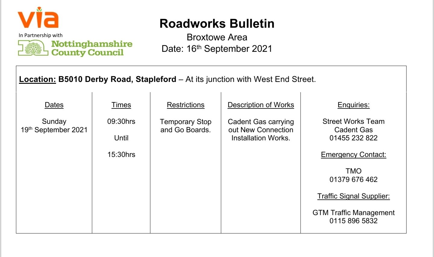 Roadworks Bulletin – Temporary Traffic Signals – B5010 Derby Road, Stapleford. 16Sep 2021Add a comment Roadworks Bulletin – Temporary Traffic Signals – B5010 Derby Road, Stapleford. Share this:Tweet Click to share on WhatsApp (Opens in new window) WhatsApp Click to email a link to a friend (Opens in new window) Email Like Loading... Related