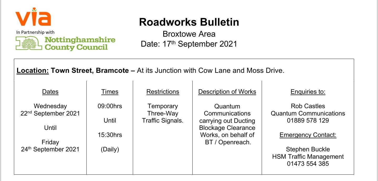 Roadworks Bulletin – Temporary Traffic Signals – Town Street, Bramcote