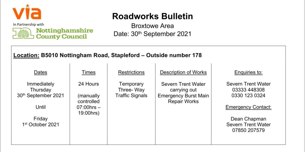 Emergency Roadworks Bulletin – Temporary Traffic Signals – B5010 Nottingham Road, Stapleford 30Sep 2021Add a comment Emergency Roadworks Bulletin – Temporary Traffic Signals – B5010 Nottingham Road, Stapleford Share this:Tweet Share on WhatsApp (Opens in new window) WhatsApp Email a link to a friend (Opens in new window) Email Like Loading... Related