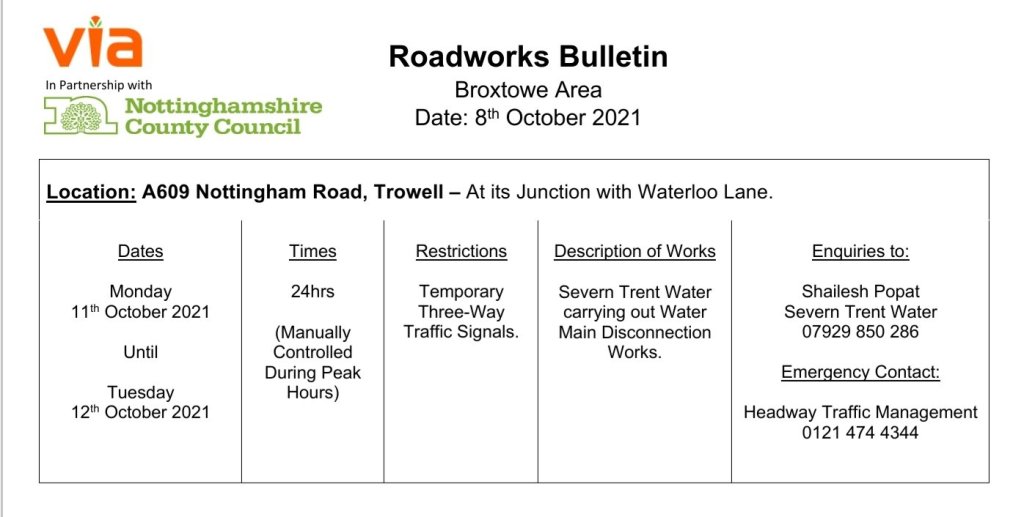 Roadworks Bulletin – Temporary Traffic Signals – A609 Nottingham Road, Trowell 8Oct 2021Add a comment Roadworks Bulletin – Temporary Traffic Signals – A609 Nottingham Road, Trowell Share this:Tweet Click to share on WhatsApp (Opens in new window) WhatsApp Click to email a link to a friend (Opens in new window) Email Like Loading... Related