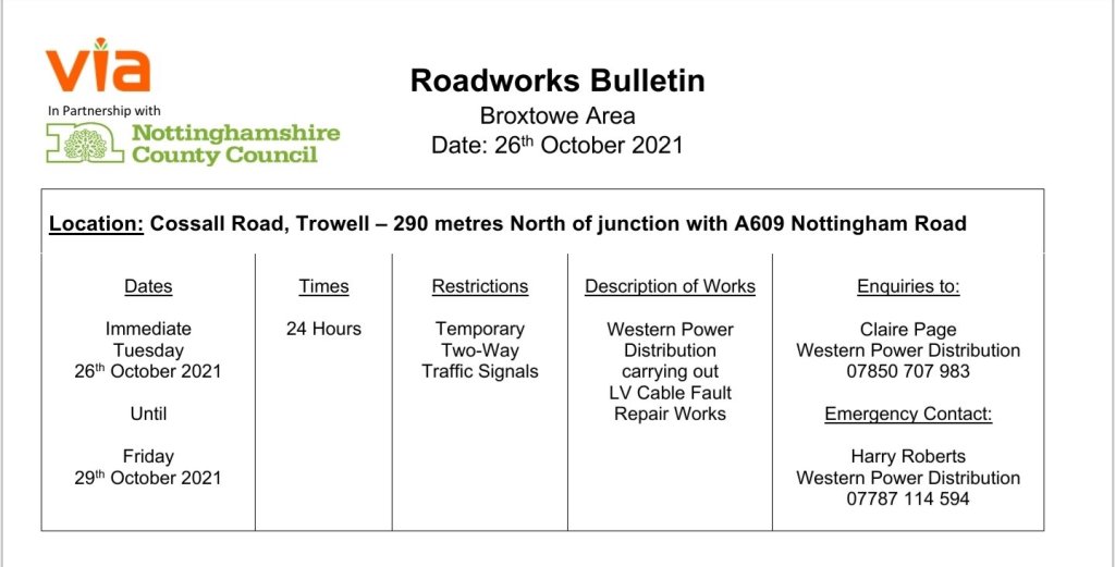 Roadworks Bulletin – Temporary Traffic Signals – Cossall Road, Trowell 26Oct 2021Add a comment Roadworks Bulletin – Temporary Traffic Signals – Cossall Road, Trowell Share this:Tweet Click to share on WhatsApp (Opens in new window) WhatsApp Click to email a link to a friend (Opens in new window) Email Like Loading... Related