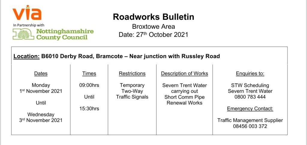 Roadworks Bulletin – Temporary Traffic Signals – B6010 Derby Road, Bramcote