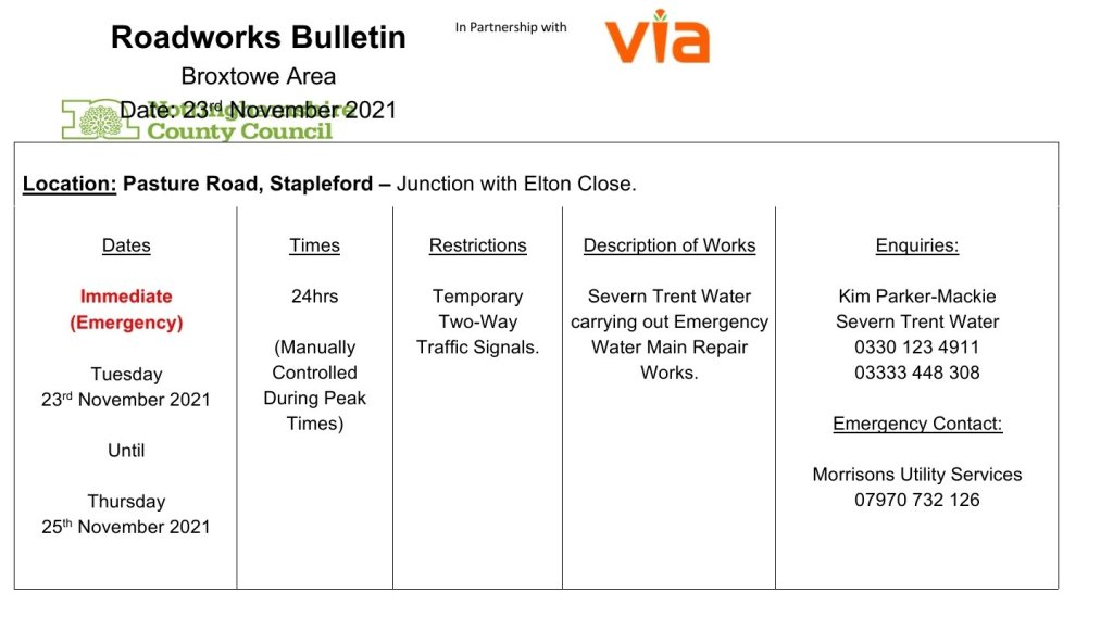 Roadworks Bulletin – Temporary Traffic Signals – Pasture Road, Stapleford. 23Nov 2021Add a comment Roadworks Bulletin – Temporary Traffic Signals – Pasture Road, Stapleford. Share this:Tweet Click to share on WhatsApp (Opens in new window) WhatsApp Click to email a link to a friend (Opens in new window) Email Like Loading... Related