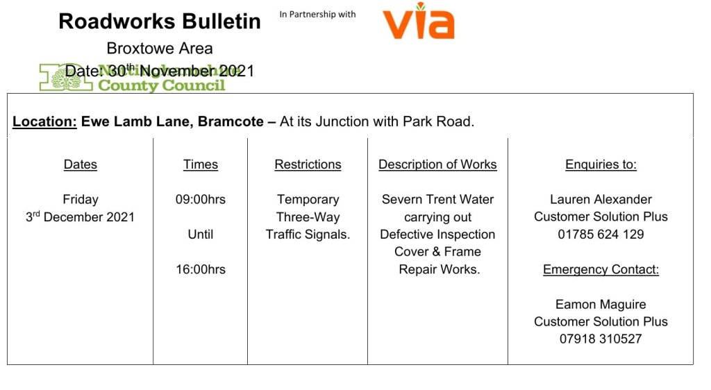 Roadworks Bulletin – Temporary Traffic Signals – Ewe Lamb Lane, Bramcote 30Nov 2021Add a comment Roadworks Bulletin – Temporary Traffic Signals – Ewe Lamb Lane, Bramcote Share this:Tweet Share on WhatsApp (Opens in new window) WhatsApp Email a link to a friend (Opens in new window) Email Like Loading... Related