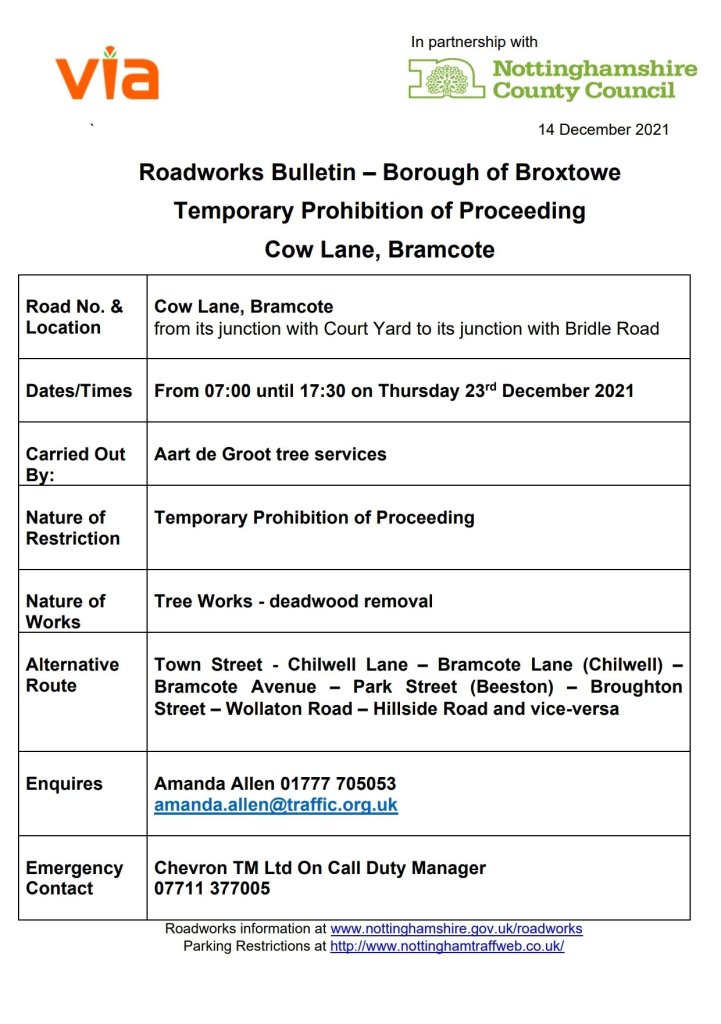 Roadworks Bulletin – Temporary Road Closure – Cow Lane, Bramcote 14Dec 20211 Comment Roadworks Bulletin – Temporary Road Closure – Cow Lane, Bramcote Share this:Tweet Click to share on WhatsApp (Opens in new window) WhatsApp Click to email a link to a friend (Opens in new window) Email Like Loading... Related