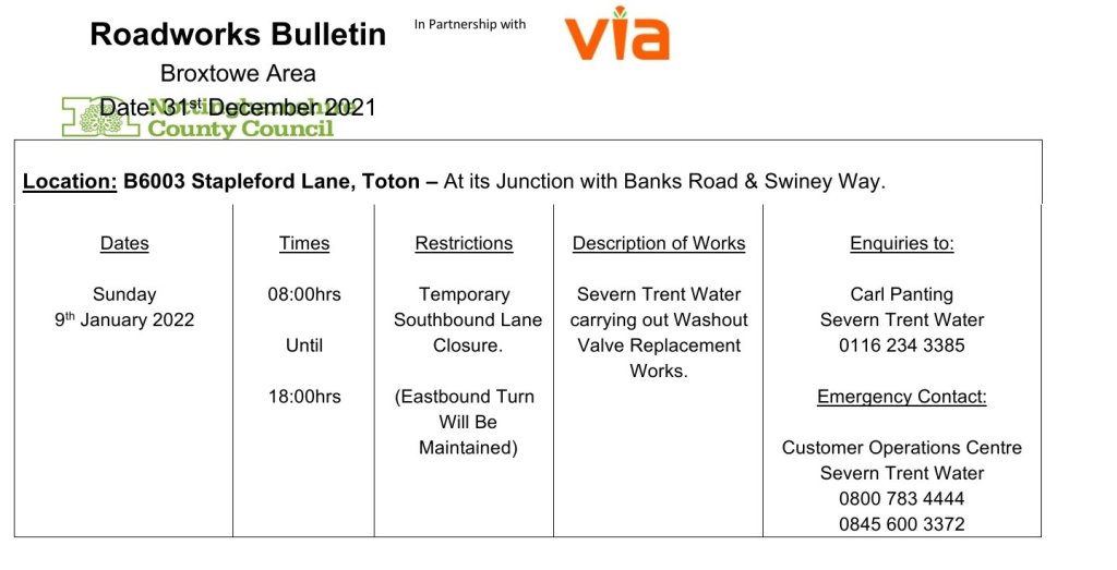 Roadworks Bulletin – Temporary Traffic Signals – B6003 Stapleford Lane, Toton. 31Dec 202131 Dec 2021Add a comment Roadworks Bulletin – Temporary Traffic Signals – B6003 Stapleford Lane, Toton. Share this:Tweet Click to share on WhatsApp (Opens in new window) WhatsApp Click to email a link to a friend (Opens in new window) Email Like Loading... Related