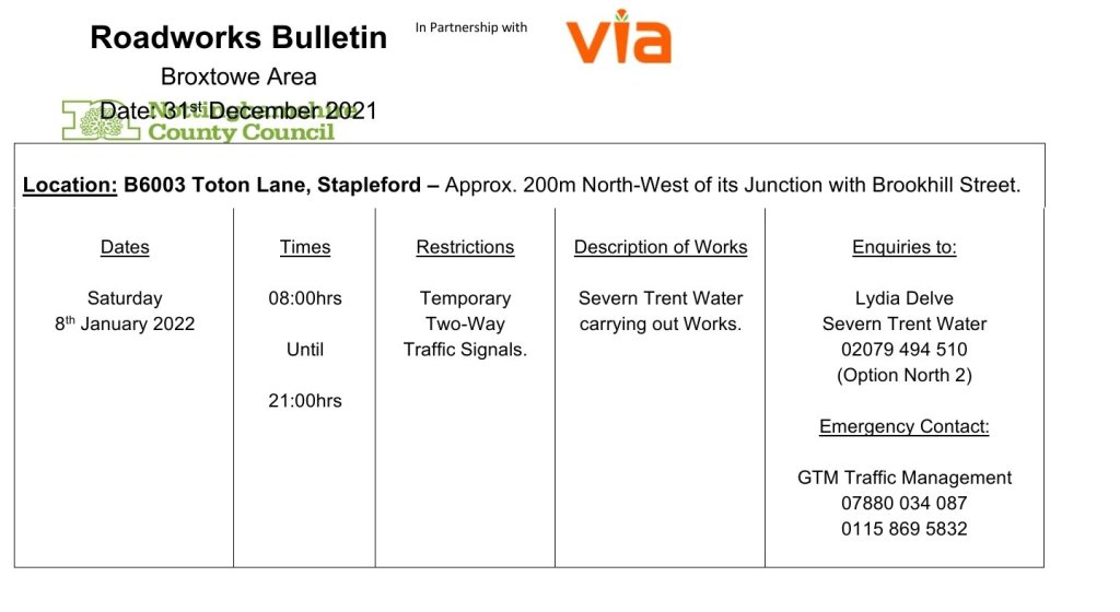 Roadworks Bulletin – Temporary Traffic Signals – B6003 Toton Lane, Stapleford. 31Dec 2021Add a comment Roadworks Bulletin – Temporary Traffic Signals – B6003 Toton Lane, Stapleford. Share this:Tweet Click to share on WhatsApp (Opens in new window) WhatsApp Click to email a link to a friend (Opens in new window) Email Like Loading... Related