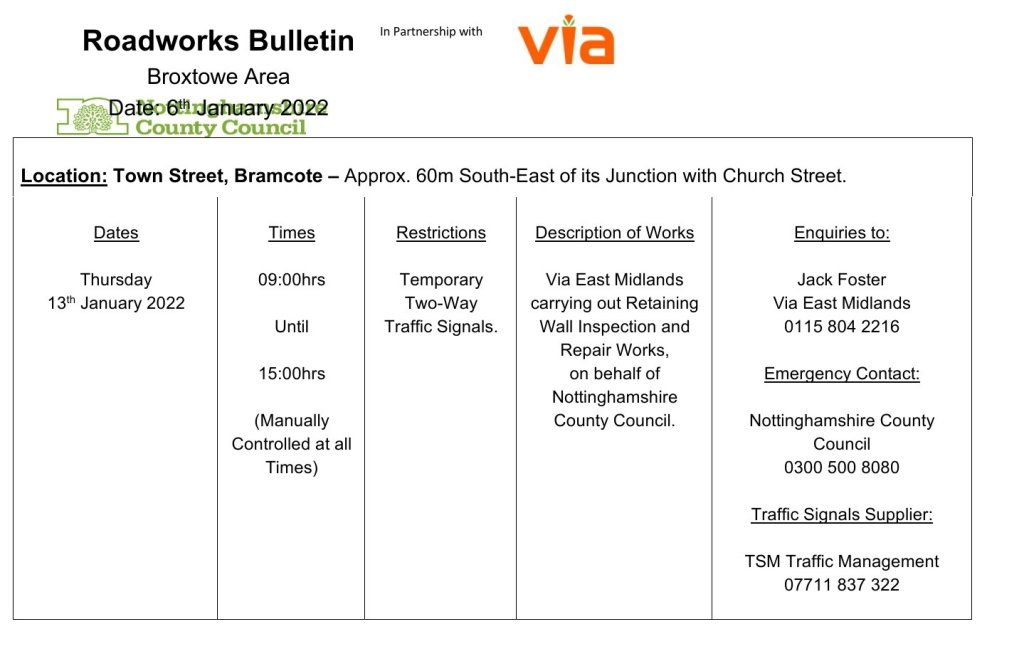 Roadworks Bulletin – Temporary Traffic Signals – Town Street, Bramcote 6Jan 20221 Comment Roadworks Bulletin – Temporary Traffic Signals – Town Street, Bramcote Share this:Tweet Click to share on WhatsApp (Opens in new window) WhatsApp Click to email a link to a friend (Opens in new window) Email Like Loading... Related