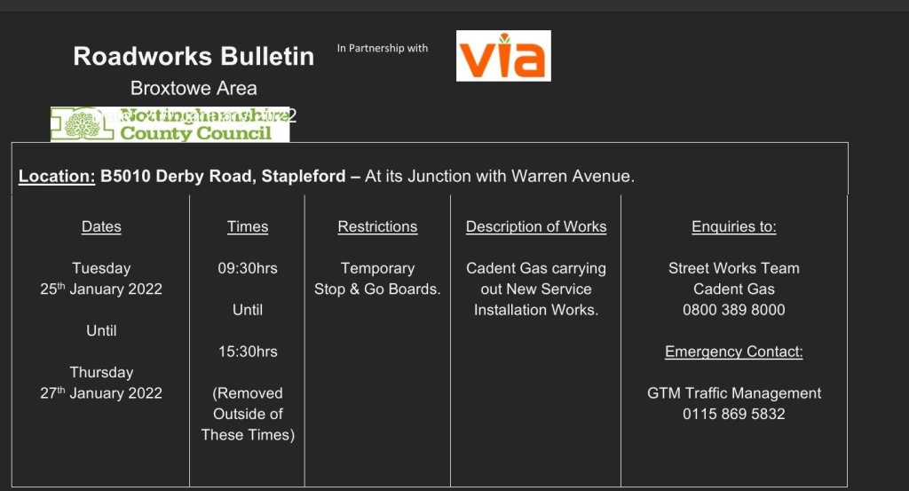 Roadworks Bulletin – Temporary Traffic Signals – B5010 Derby Road, Stapleford 20Jan 2022Add a comment Roadworks Bulletin – Temporary Traffic Signals – B5010 Derby Road, Stapleford Share this:Tweet Click to share on WhatsApp (Opens in new window) WhatsApp Click to email a link to a friend (Opens in new window) Email Like Loading... Related