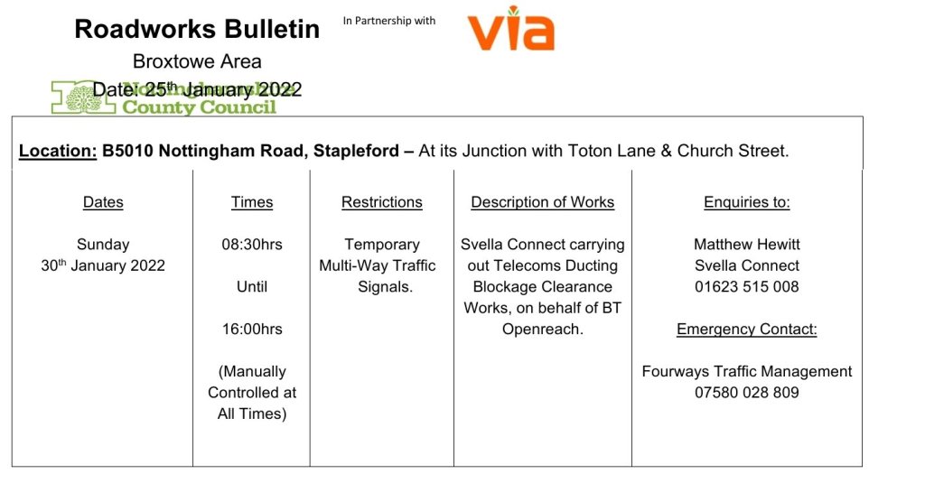 Roadworks Bulletin – Temporary Traffic Signals – B5010 Nottingham Road, Stapleford. 25Jan 2022Add a comment Roadworks Bulletin – Temporary Traffic Signals – B5010 Nottingham Road, Stapleford. Share this:Tweet Click to share on WhatsApp (Opens in new window) WhatsApp Click to email a link to a friend (Opens in new window) Email Like Loading... Related
