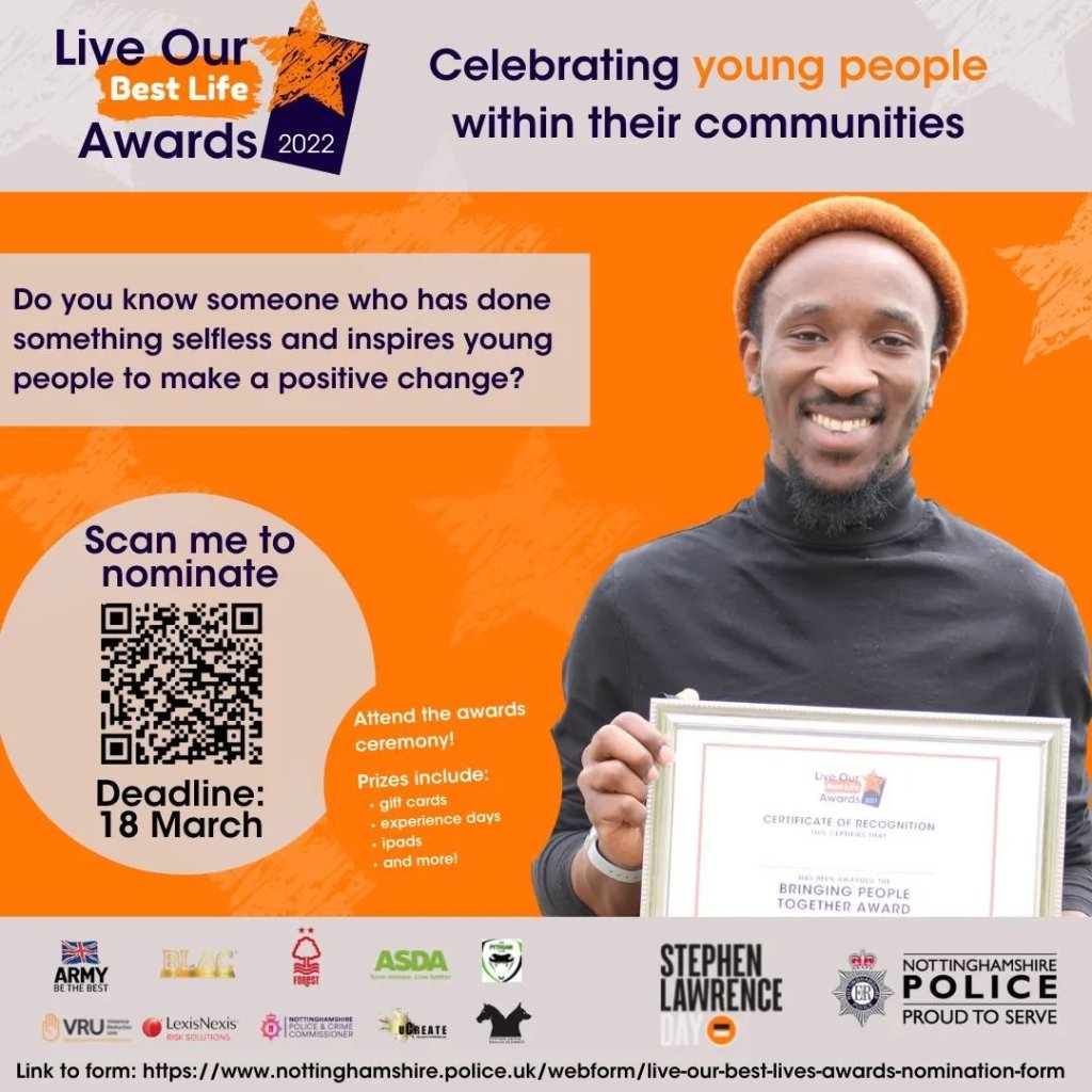 Nottinghamshire Police has opened nominations today (29 January 2022) for the Live Our Best Life Awards, aimed at recognising the incredible hard work and fantastic achievements made by young people throughout the county.