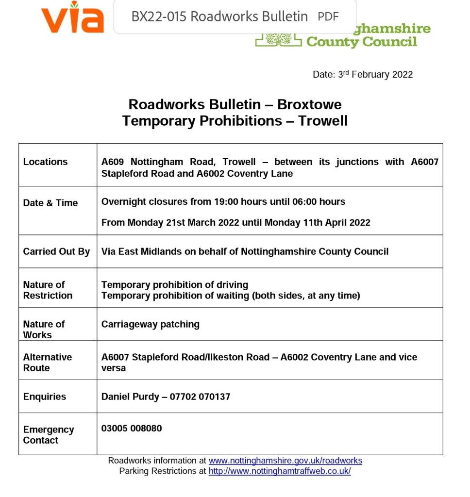 Roadworks Bulletin – Temporary Road Closure – Nottingham Road, Trowell 3Feb 2022Add a comment Roadworks Bulletin – Temporary Road Closure – Nottingham Road, Trowell Share this:Tweet Click to share on WhatsApp (Opens in new window) WhatsApp Click to email a link to a friend (Opens in new window) Email Like Loading... Related