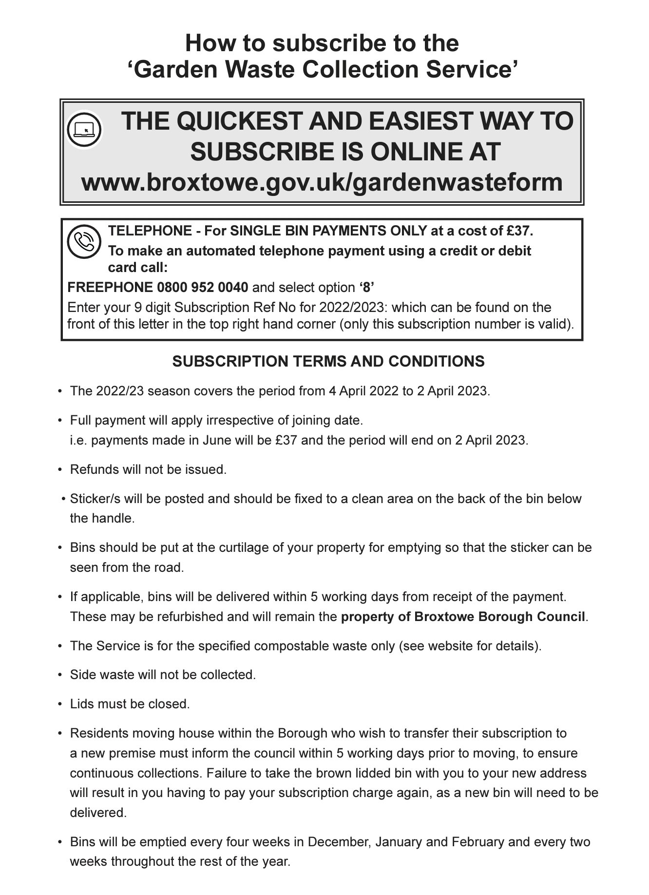 Next week, residents in Broxtowe will be able to renew their garden waste subscription for the 2022/23 season. This will run from Monday 4th April through to 2nd April 2023.