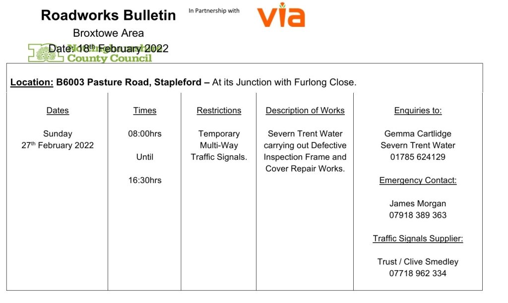 Roadworks Bulletin – Temporary Traffic Signals – B003 Pasture Road, Stapleford. 18Feb 2022Add a comment Roadworks Bulletin – Temporary Traffic Signals – B003 Pasture Road, Stapleford. Share this:Tweet Click to share on WhatsApp (Opens in new window) WhatsApp Click to email a link to a friend (Opens in new window) Email Like Loading... Related