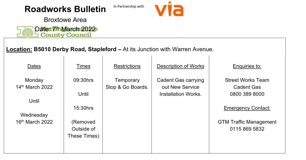 Roadworks Bulletin – Temporary Traffic Signals – B5010 Derby Road, Stapleford. 7Mar 2022Add a comment Roadworks Bulletin – Temporary Traffic Signals – B5010 Derby Road, Stapleford. Share this:Tweet Click to share on WhatsApp (Opens in new window) WhatsApp Click to email a link to a friend (Opens in new window) Email Like Loading... Related