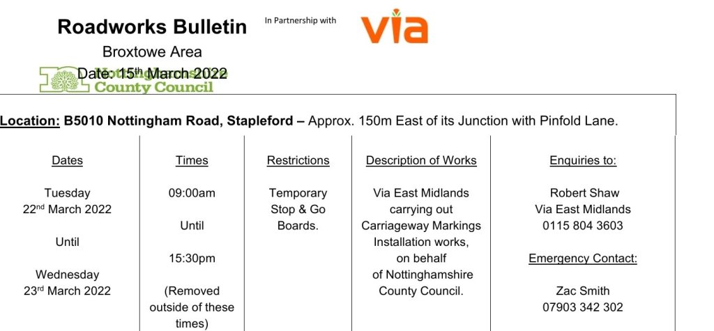 Roadworks Bulletin – Temporary Traffic Signals – B5010 Nottingham Road, Stapleford 15Mar 2022Add a comment Roadworks Bulletin – Temporary Traffic Signals – B5010 Nottingham Road, Stapleford Share this:Tweet Click to share on WhatsApp (Opens in new window) WhatsApp Click to email a link to a friend (Opens in new window) Email Like Loading... Related