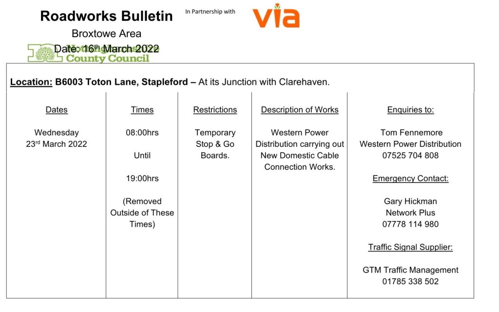 Roadworks Bulletin – Temporary Traffic Signals – B6003 Toton Lane, Stapleford. 16Mar 2022Add a comment Roadworks Bulletin – Temporary Traffic Signals – B6003 Toton Lane, Stapleford. Share this:Tweet Click to share on WhatsApp (Opens in new window) WhatsApp Click to email a link to a friend (Opens in new window) Email Like Loading... Related