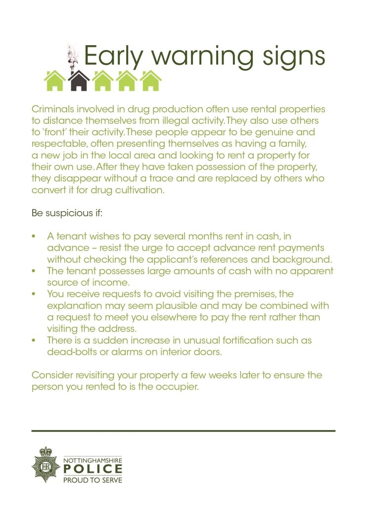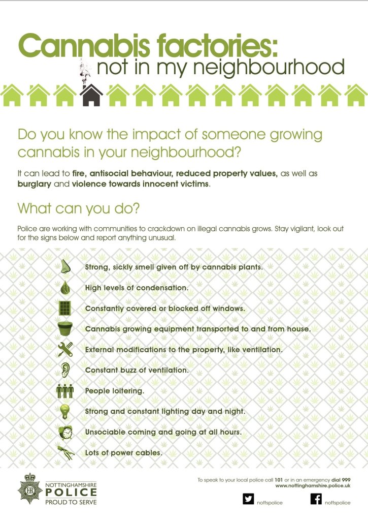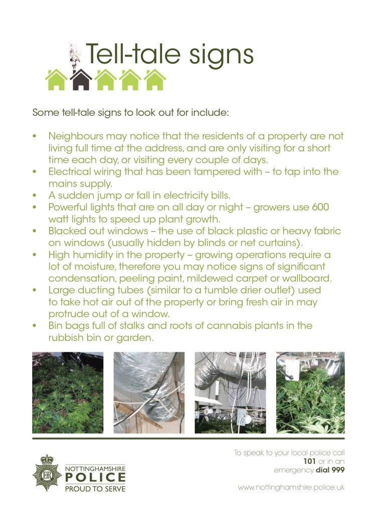 Nottinghamshire Police is asking members of the community to look out for signs that cannabis growers are active in their neighbourhood.