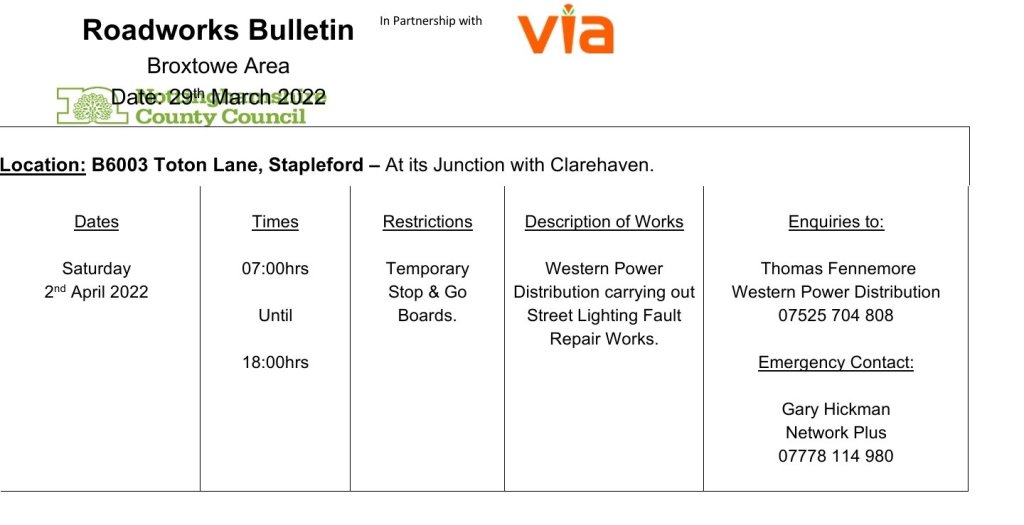 Roadworks Bulletin – Temporary Traffic Signals – B6003 Toton Lane, Stapleford 29Mar 2022Add a comment Roadworks Bulletin – Temporary Traffic Signals – B6003 Toton Lane, Stapleford Share this:Tweet Click to share on WhatsApp (Opens in new window) WhatsApp Click to email a link to a friend (Opens in new window) Email Like Loading... Related