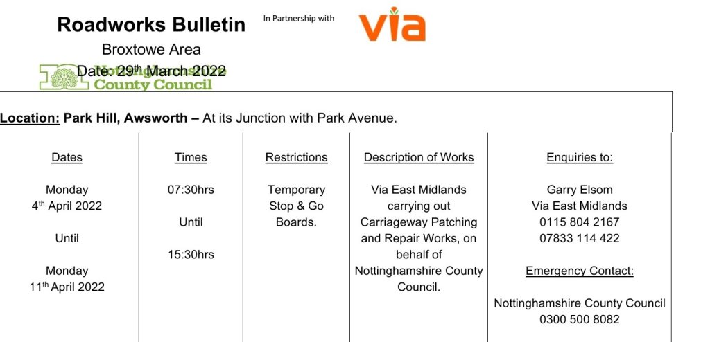 Roadworks Bulletin – Temporary Traffic Signals – Park Hill, Awsworth 29Mar 2022Add a comment Roadworks Bulletin – Temporary Traffic Signals – Park Hill, Awsworth Share this:Tweet Click to share on WhatsApp (Opens in new window) WhatsApp Click to email a link to a friend (Opens in new window) Email Like Loading... Related