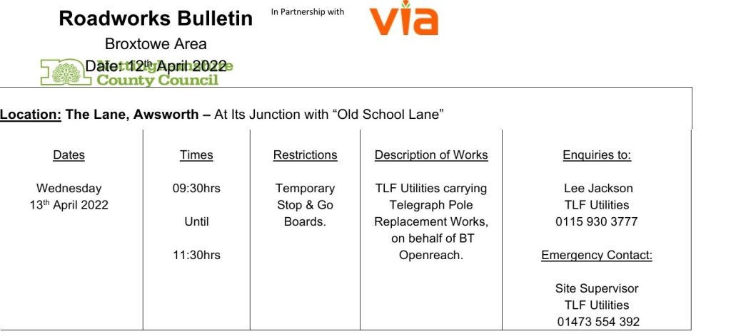 Roadworks Bulletin – Temporary Traffic Signals – The Lane, Awsworth 12Apr 2022Add a comment Roadworks Bulletin – Temporary Traffic Signals – The Lane, Awsworth Share this:Tweet Click to share on WhatsApp (Opens in new window) WhatsApp Click to email a link to a friend (Opens in new window) Email Like Loading... Related