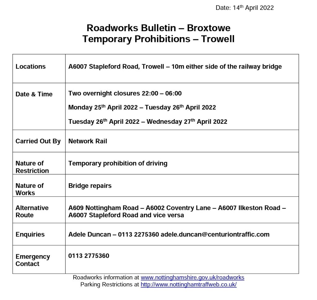 Roadworks Bulletin – Temporary Road Closure – Stapleford Road, Trowell 14Apr 2022Add a comment Roadworks Bulletin – Temporary Road Closure – Stapleford Road, Trowell Share this:Tweet Click to share on WhatsApp (Opens in new window) WhatsApp Click to email a link to a friend (Opens in new window) Email Like Loading... Related
