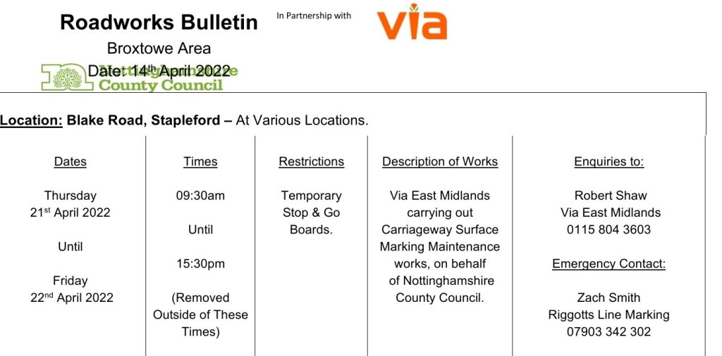 Roadworks Bulletin – Temporary Traffic Signals – Blake Road & Brookhill Street, Stapleford 14Apr 2022Add a comment Roadworks Bulletin – Temporary Traffic Signals – Blake Road & Brookhill Street, Stapleford Share this:Tweet Click to share on WhatsApp (Opens in new window) WhatsApp Click to email a link to a friend (Opens in new window) Email Like Loading... Related