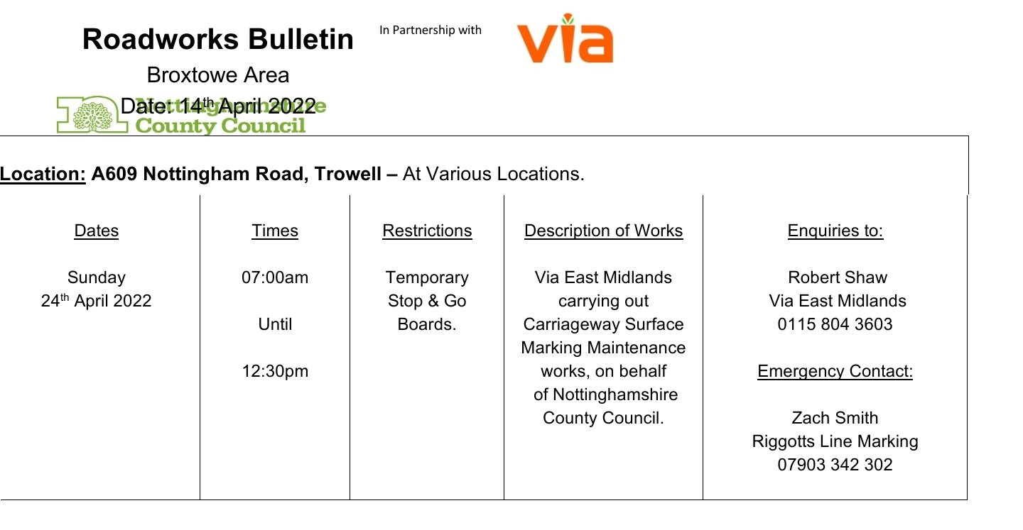 Roadworks Bulletin – Temporary Traffic Signals – Nottingham Road & Stapleford Lane, Trowell 14Apr 2022Add a comment Roadworks Bulletin – Temporary Traffic Signals – Nottingham Road & Stapleford Lane, Trowell Share this:Tweet Click to share on WhatsApp (Opens in new window) WhatsApp Click to email a link to a friend (Opens in new window) Email Like Loading... Related