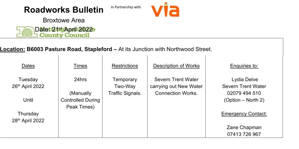Roadworks Bulletin – Temporary Traffic Signals – B6003 Pasture Road, Stapleford. 21Apr 2022Add a comment Roadworks Bulletin – Temporary Traffic Signals – B6003 Pasture Road, Stapleford. Share this:Tweet Click to share on WhatsApp (Opens in new window) WhatsApp Click to email a link to a friend (Opens in new window) Email Like Loading... Related