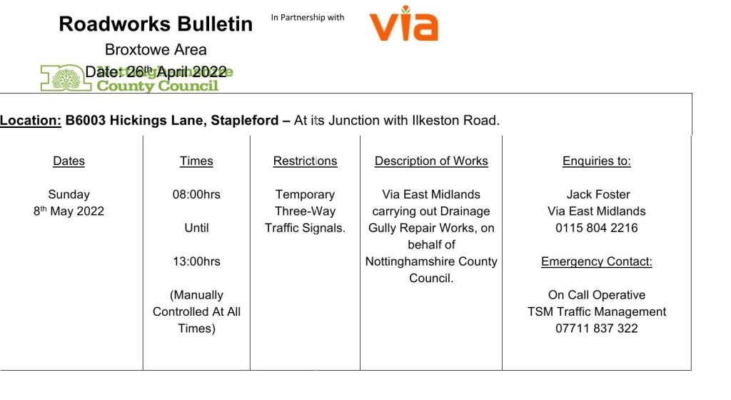 Roadworks Bulletin – Temporary Traffic Signals – B6003 Hickings Lane, Stapleford 26Apr 2022Add a comment Roadworks Bulletin – Temporary Traffic Signals – B6003 Hickings Lane, Stapleford Share this:Tweet Click to share on WhatsApp (Opens in new window) WhatsApp Click to email a link to a friend (Opens in new window) Email Like Loading... Related