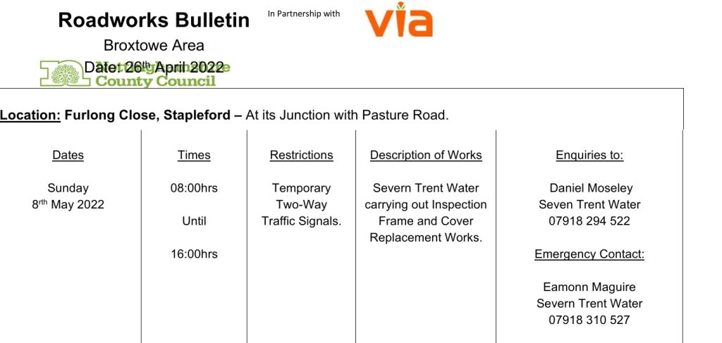 Roadworks Bulletin – Temporary Traffic Signals – Furlong Close, Stapleford 26Apr 2022Add a comment Roadworks Bulletin – Temporary Traffic Signals – Furlong Close, Stapleford Share this:Tweet Click to share on WhatsApp (Opens in new window) WhatsApp Click to email a link to a friend (Opens in new window) Email Like Loading... Related
